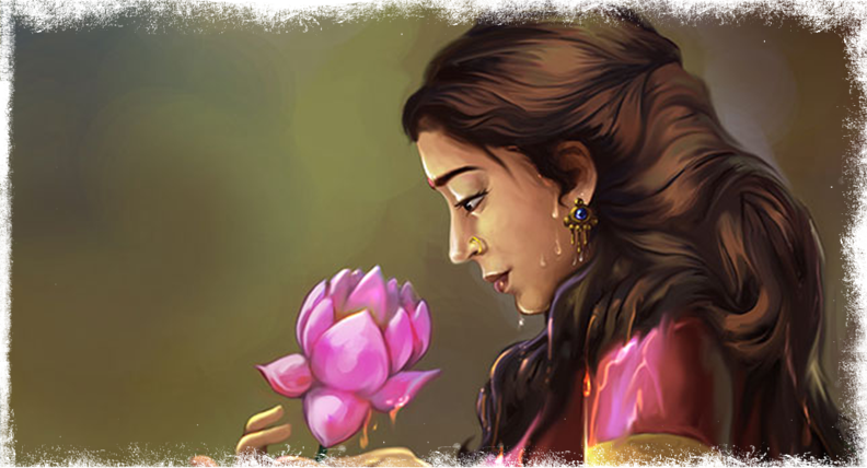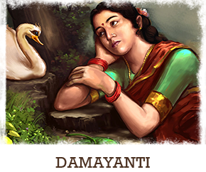 Damayanti, rejecting even divine suitors, married Nala whom she had already given her heart to. She stuck with him even when he lost his kingdom in a game of dice and had to go starving and hungry in the forests. Even when Nala deserted her, she trusted his love for her and traced him out through tremendous odds. Damayanti was at last reunited with him and at last, the tide of luck changed, and she, as queen, sat enthroned in splendour by Nala’s side.