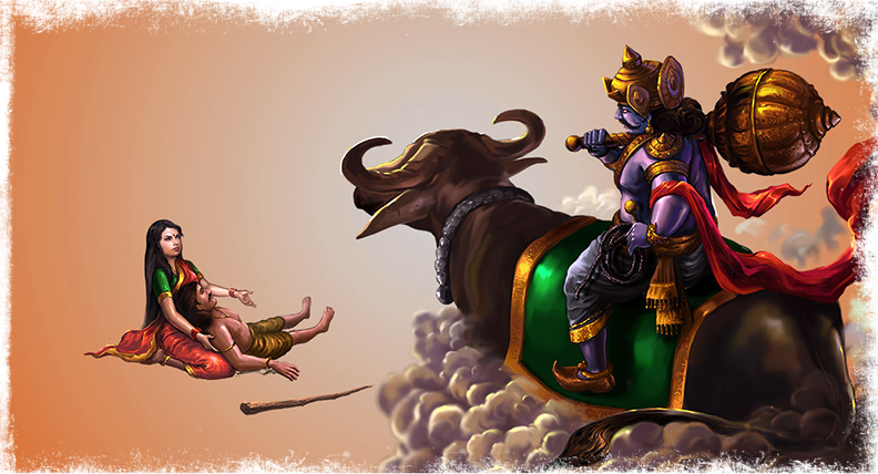 Brought up amidst luxury, one day, The grown Savitri, saw on one of her excursions to the forest, Satyavati (Satyavan) serving his old blind royal father and mother who had lost their kingdom. This sight made her give her heart to him and she couldn’t be dissuaded from taking it away even when Narada said that Satyavati had just a year to live. Satyavati married and the year in the forest passed in bliss. With only four days remaining for the year to be completed, she took up the vow of Triratra (three nights’ penance). Daily fasts, nightly vigils, and incessant prayers from her anguished heart burnt the last remnant of dross from her, and Savitri, pale and thin, shone like the flame of a lamp in a holy temple. When the fateful day dawned, Savitri accompanied Satyavati in the forest, who after a while felt faint and rested his head on her lap. Savitri then saw Yama, the terrible god of death, approaching with a noose. Savitri stood up. Yama drew Satyavati’s soul and loped the noose around it. Savitri then followed Yama and the conversation that took place between them is thrilling, ennobling, intelligent, and profound. She walked like Yama’s shadow even on repeatedly being dissuaded and told to return to the world of mortals. Yama became pleased with Savitri’s tenacity and granted her three boons except for Satyavati’s life. Even after the boons had been granted Savitri still followed Yama and spoke so sweetly that he granted her yet another boon. Savitri, who had by this time gained complete control over herself, said: ‘Grant me as the fourth boon that through Satyavat I may have one hundred sons, strong and wise, who will perpetuate our race.’ Yama absent-mindedly granted this. She then humbly asked that how could that be possible if Yama was to take away Satyavat? Yama, the divine dispenser of judgment, delighted to court defeat from one who was so pure, so loyal, and so fearless, said, ‘O worthy lady, here is your husband; freed by me.